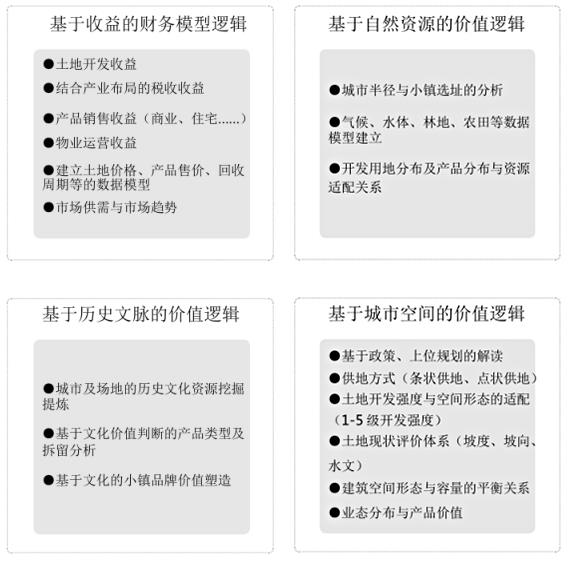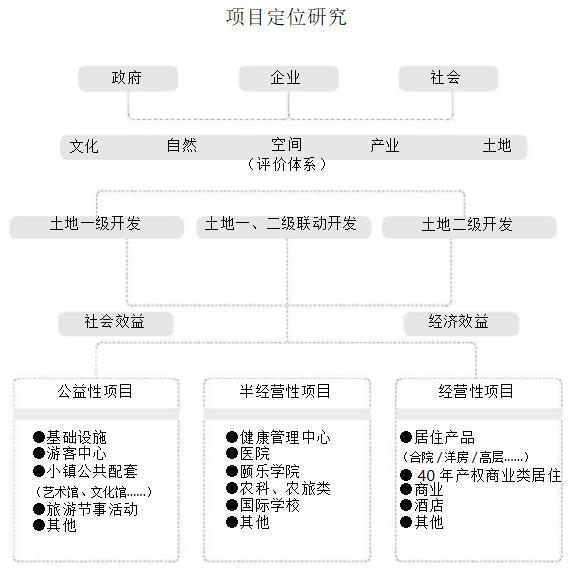 综合考虑政府、企业、社会的三方诉求,通过对文化、自然、空间、产业、土地五个维度的梳理,联动土地开发模式的思考,形成更有利于实际操作和后期运营的项目定位研究思路。