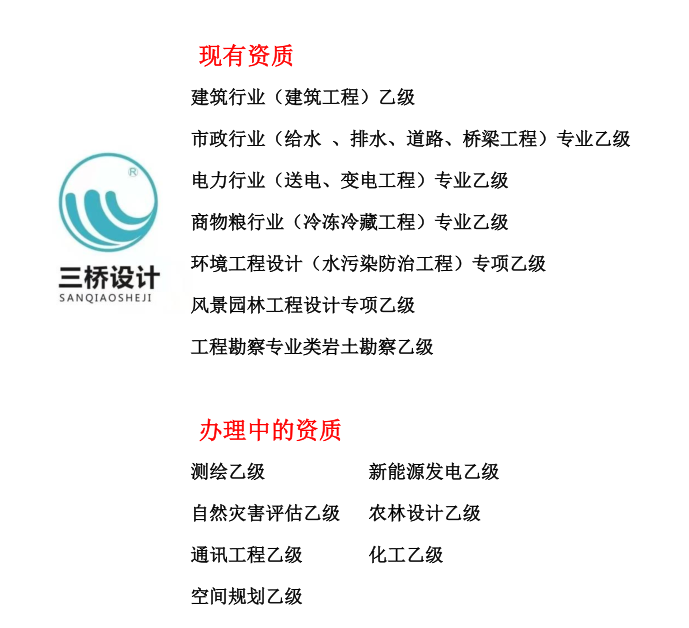 三桥自成立以来已经拥有了一批优良的资质,其中包括:建筑行业(建筑工程)乙级,市政行业(给水、排水、道路、桥梁工程)专业乙级,电力行业(送电、变电工程)专业乙级,商物粮行业(冷冻冷藏工程)专业乙级,环境工程设计(水污染防治工程)专项乙级,风景园林工程设计专项乙级,岩土勘察(岩土工程)乙级资质也拥有了一批优质的客户。现在我们勘察的备案也在进行中,最近我们完成了广东的勘察备案,接下来我们就可以用勘察资质在广东接项目啦!